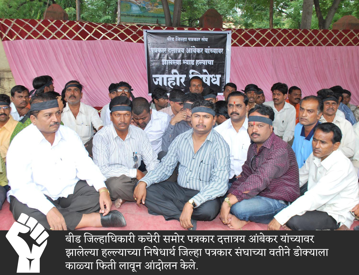 - बीड जिल्हाधिकारी कचेरी समोर पत्रकार दत्तात्रय आंबेकर यांच्यावर झालेल्या हल्ल्याच्या निषेधार्थ जिल्हा पत्रकार संघाच्या वतीने डोक्याला काळ्या फिती लावून आंदोलन केले.
