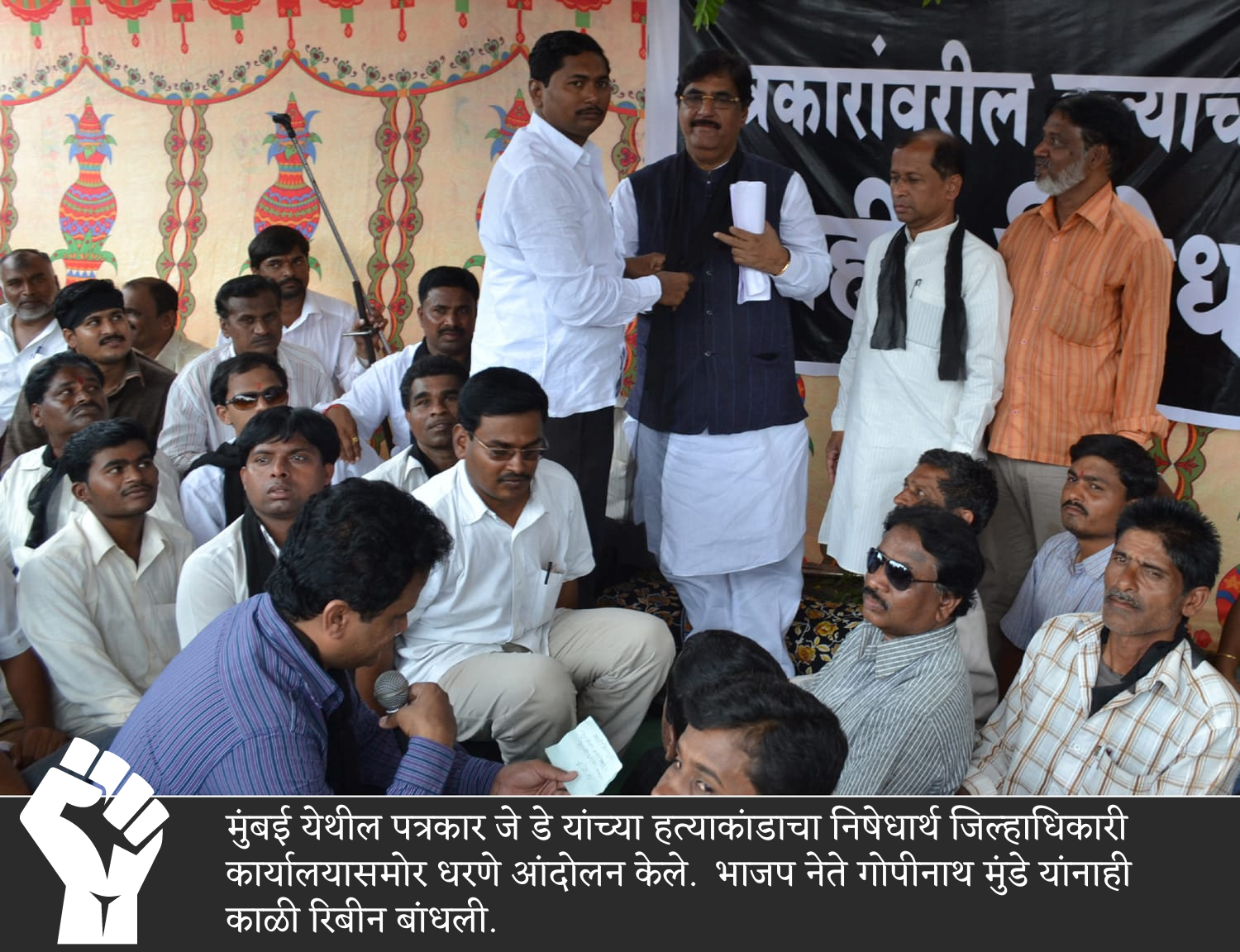 - मुंबई येथील पत्रकार जे डे यांच्या हत्याकांडाचा निषेधार्थ जिल्हाधिकारी कार्यालयासमोर धरणे आंदोलन केले. भाजप नेते गोपीनाथ मुंडे यांनाही काळी रिबीन बांधली.