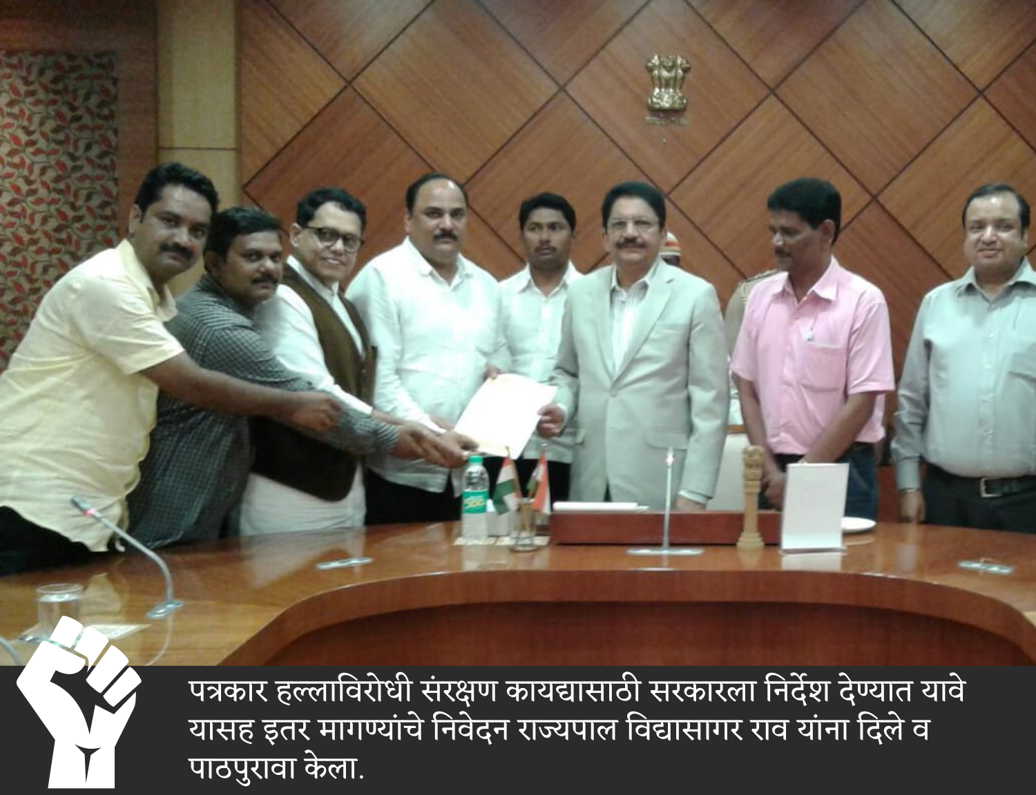 - पत्रकार हल्लाविरोधी संरक्षण कायद्यासाठी सरकारला निर्देश देण्यात यावे यासह इतर मागण्यांचे निवेदन राज्यपाल विद्यासागर राव यांना दिले व पाठपुरावा केला.