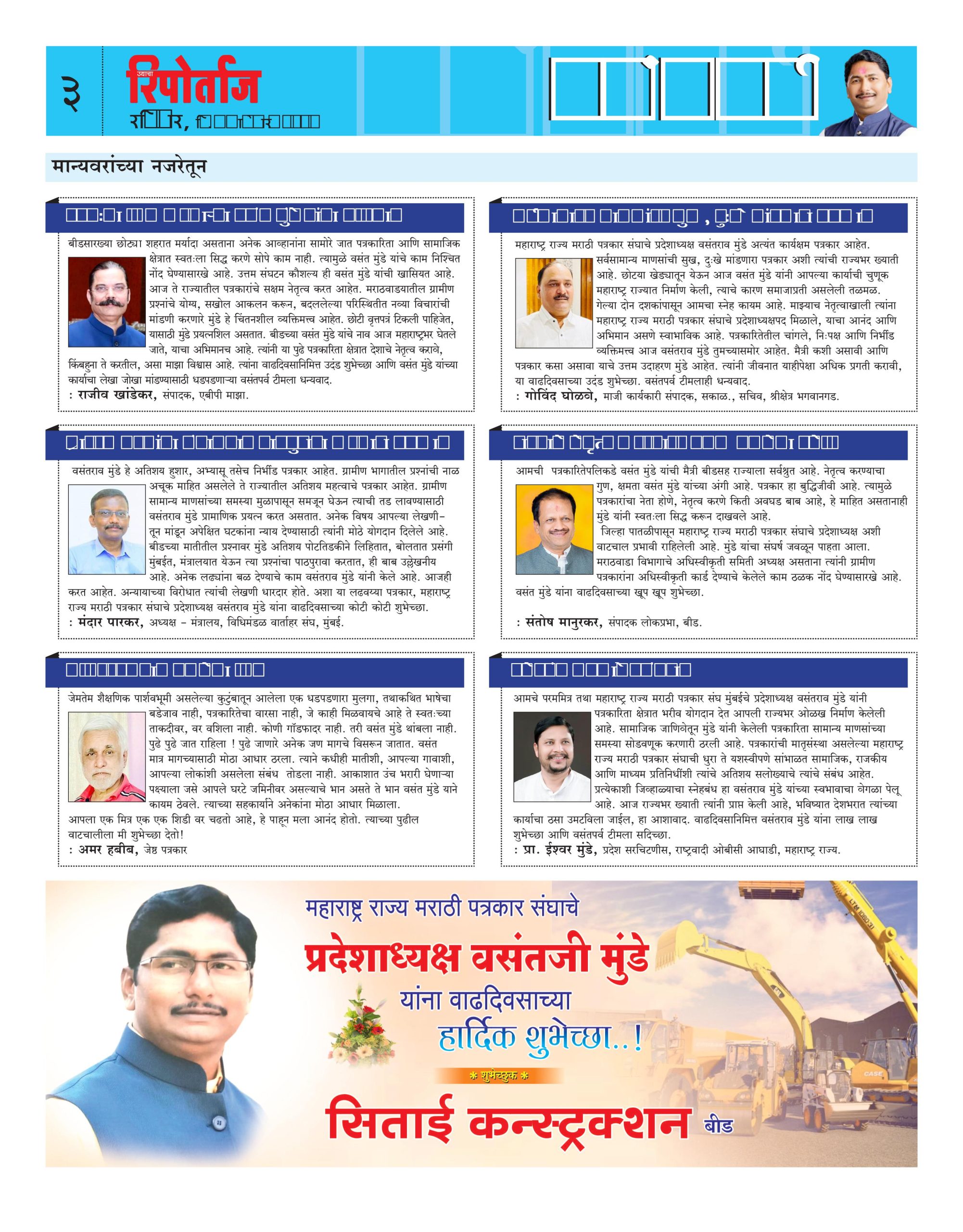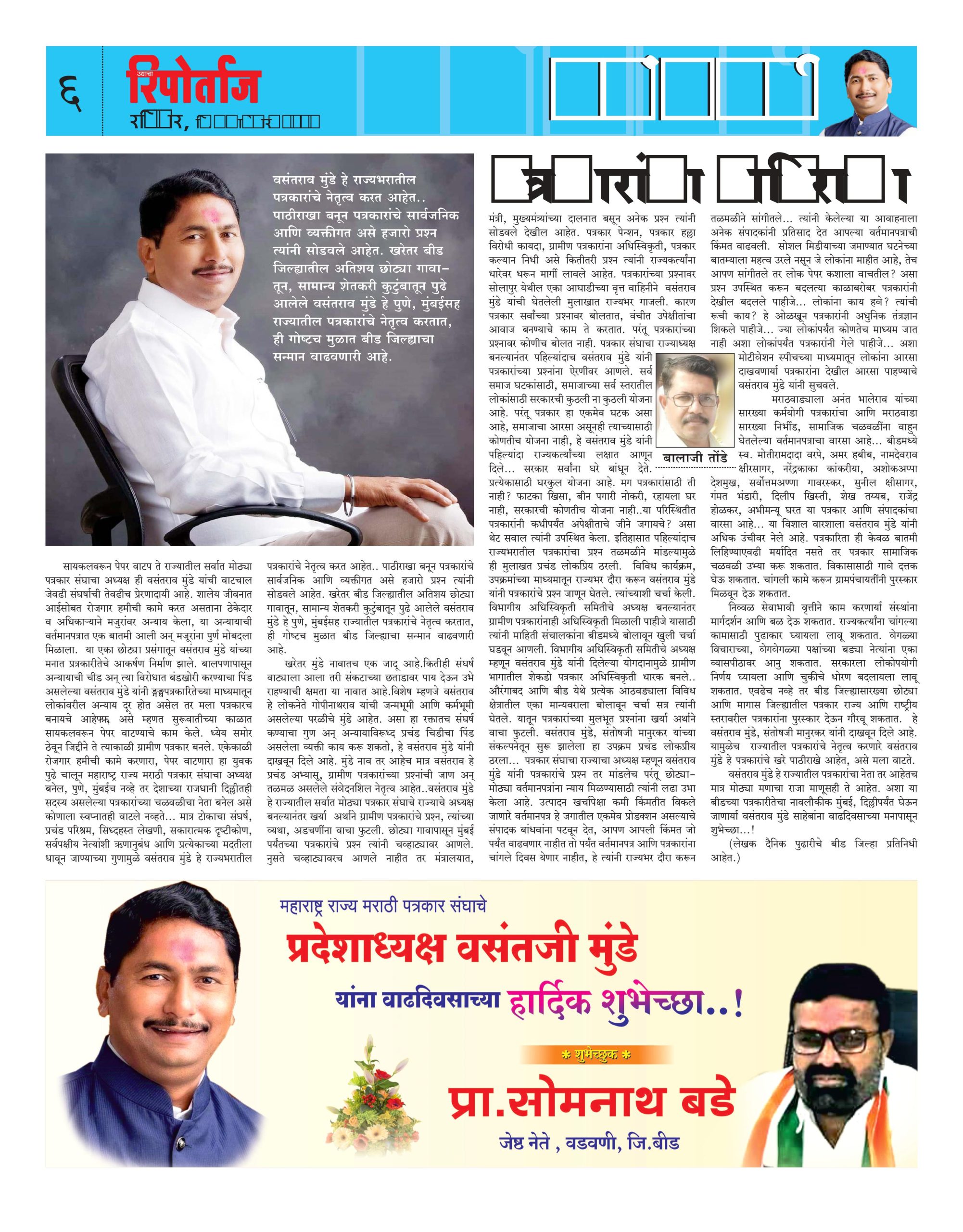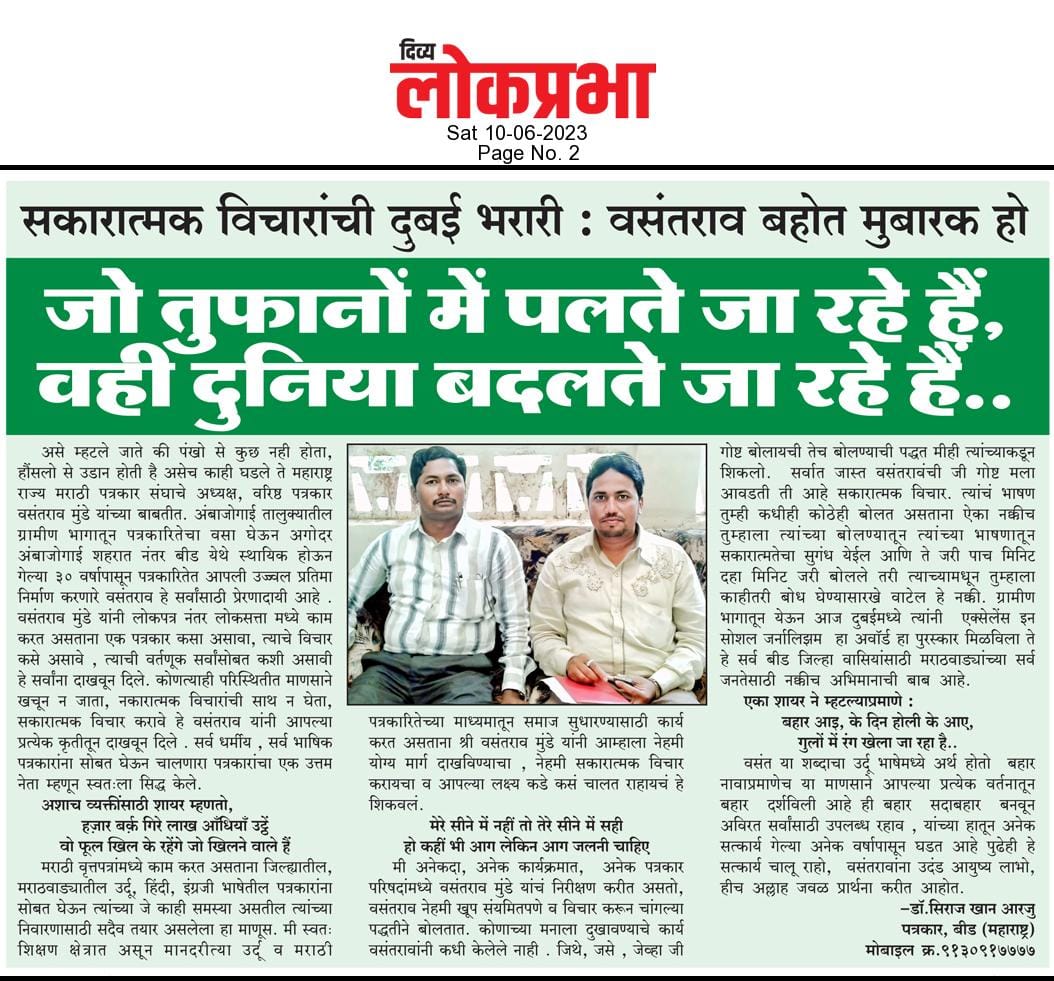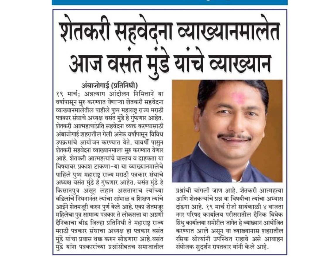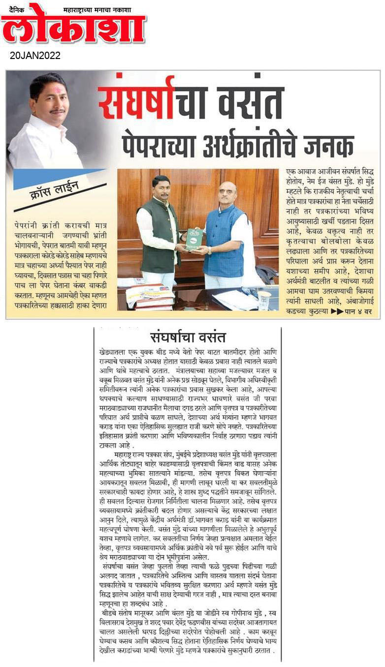 महाराष्ट्र राज्य मराठी पत्रकार संघाचे प्रदेशाध्यक्ष वसंत मुंडे यांनी पंचवीस हजारा पेक्षा अधिक पत्रकार सदस्य असलेल्या संघटनेला विविध उपक्रम राबवून सामाजिक चेहरा दिला. प्रश्न मांडून ते सोडवण्यासाठी उपाय सुचवले त्यामुळे त्यांचे संघटना व सामाजिक कार्य चौफेर असल्याने त्यांचे नेतृत्व सर्वमान्य झाले आहे अशा शब्दांत मान्यवरांनी कौतुक केले.