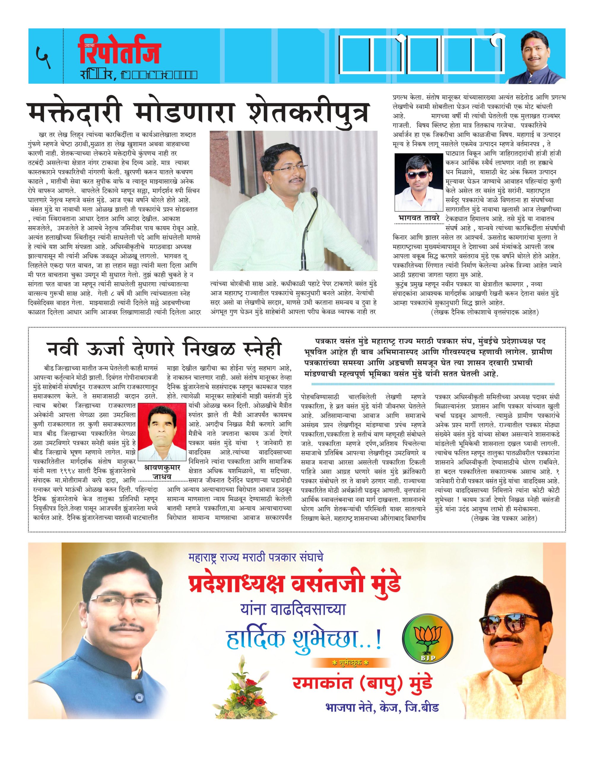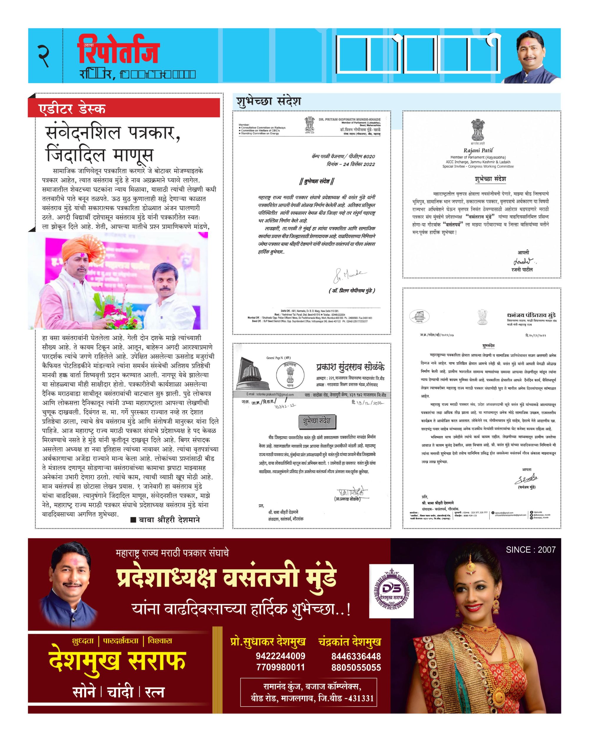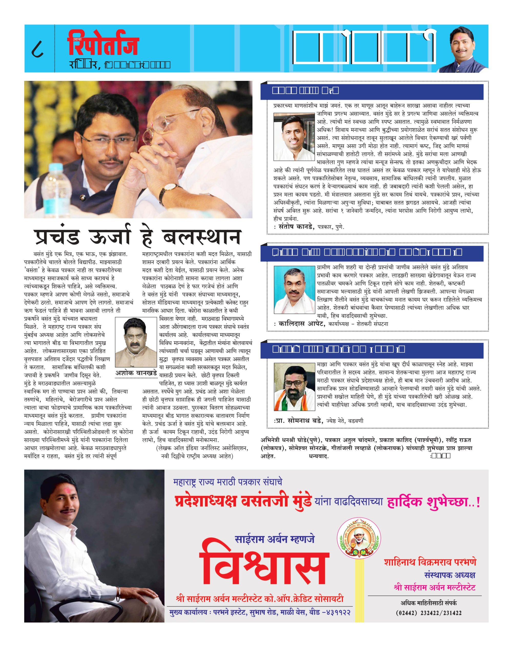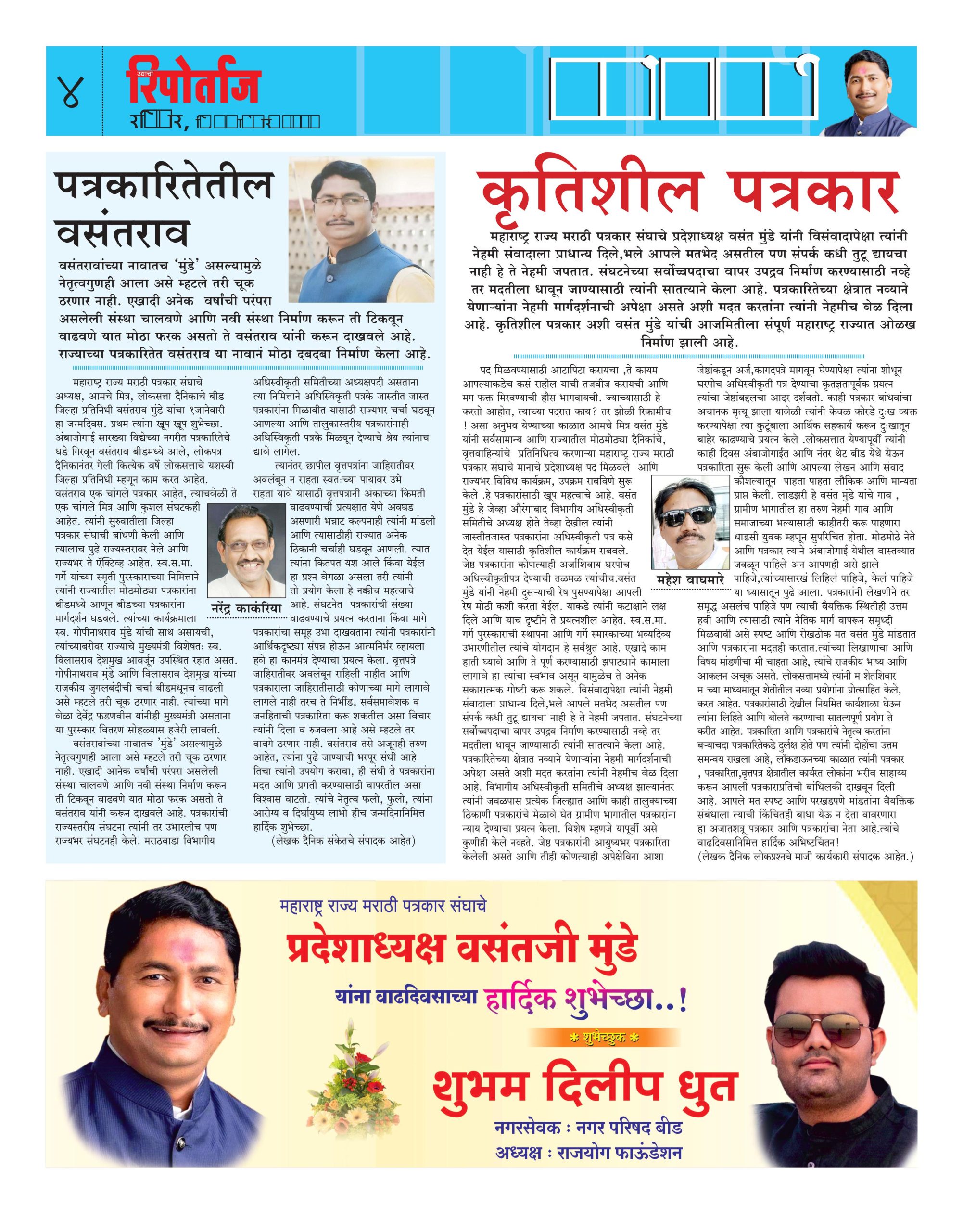 महाराष्ट्र राज्य मराठी पत्रकार संघाचे प्रदेशाध्यक्ष वसंत मुंडे यांनी पंचवीस हजारा पेक्षा अधिक पत्रकार सदस्य असलेल्या संघटनेला विविध उपक्रम राबवून सामाजिक चेहरा दिला. प्रश्न मांडून ते सोडवण्यासाठी उपाय सुचवले त्यामुळे त्यांचे संघटना व सामाजिक कार्य चौफेर असल्याने त्यांचे नेतृत्व सर्वमान्य झाले आहे अशा शब्दांत मान्यवरांनी कौतुक केले.