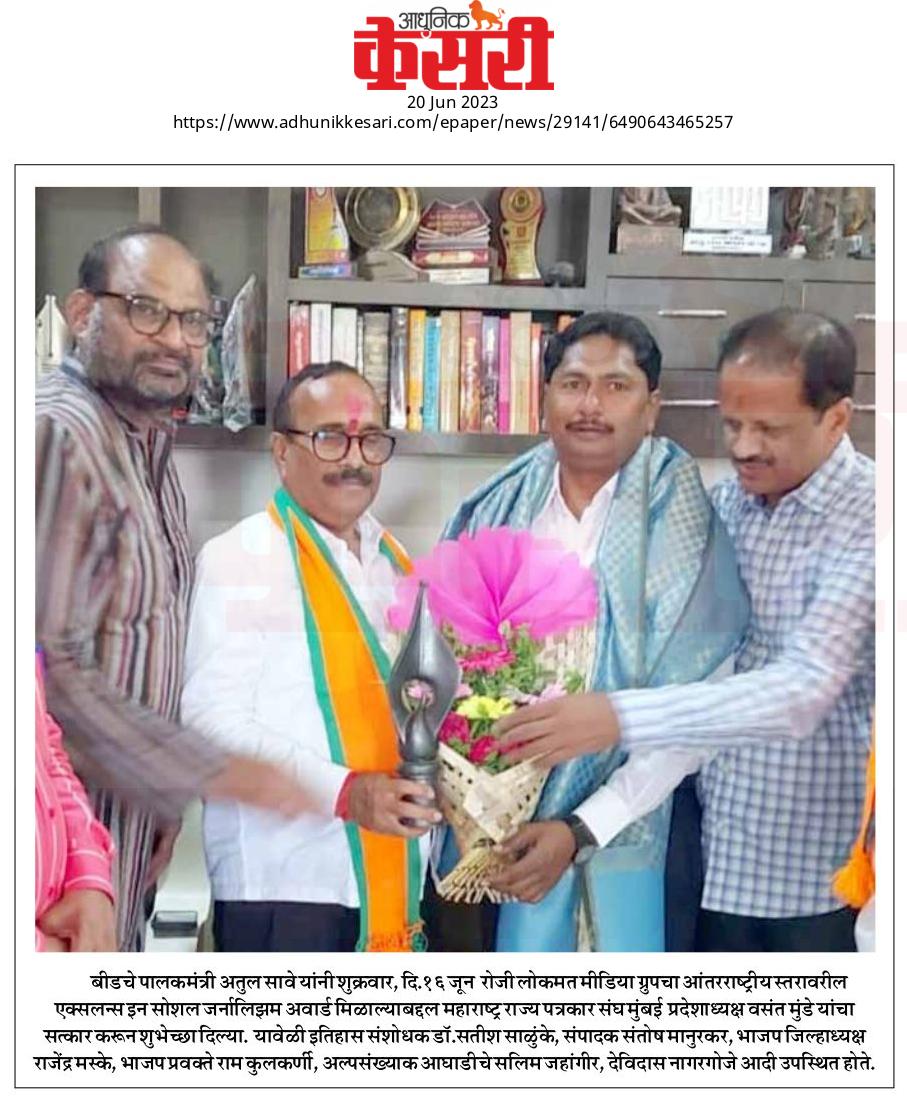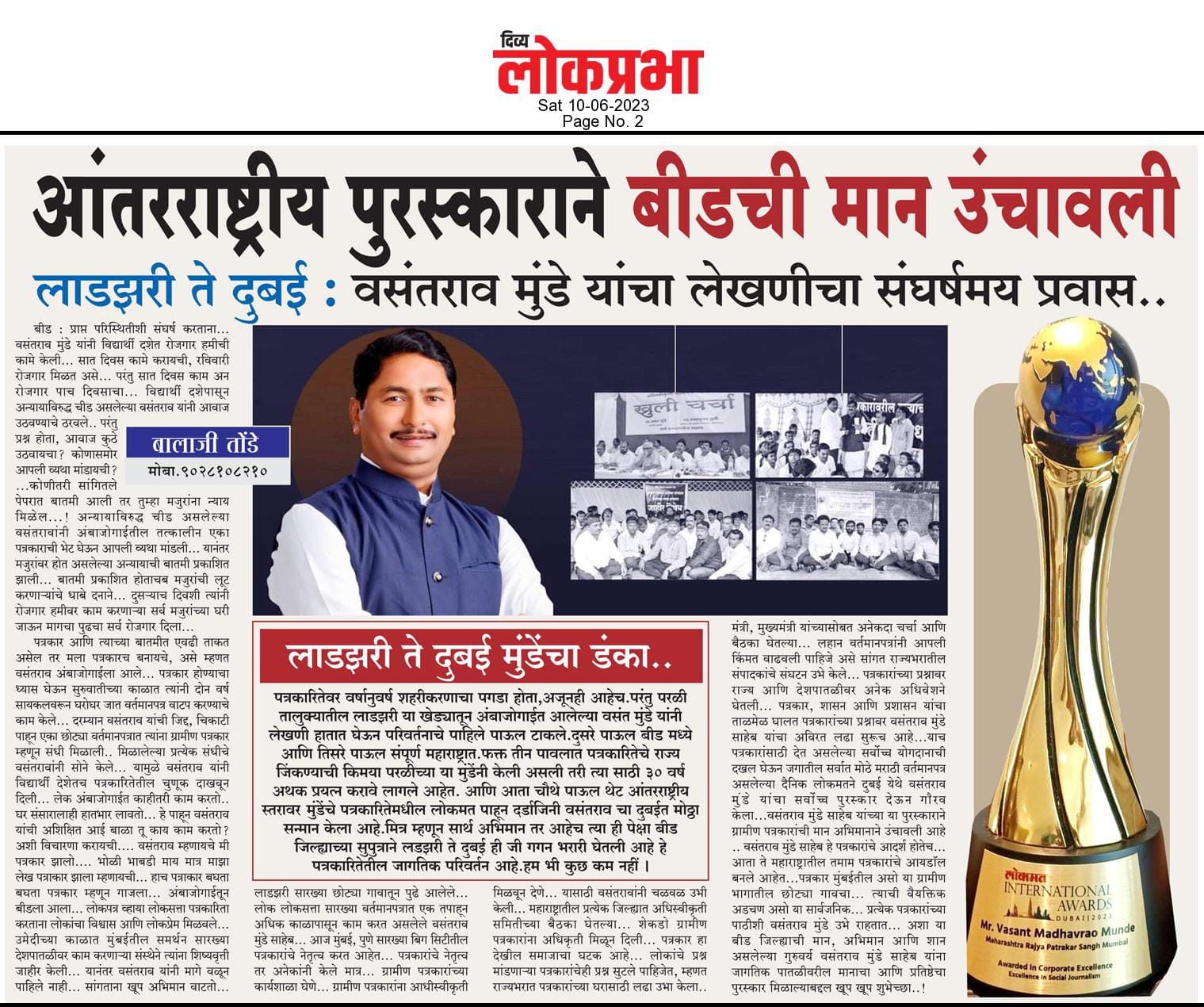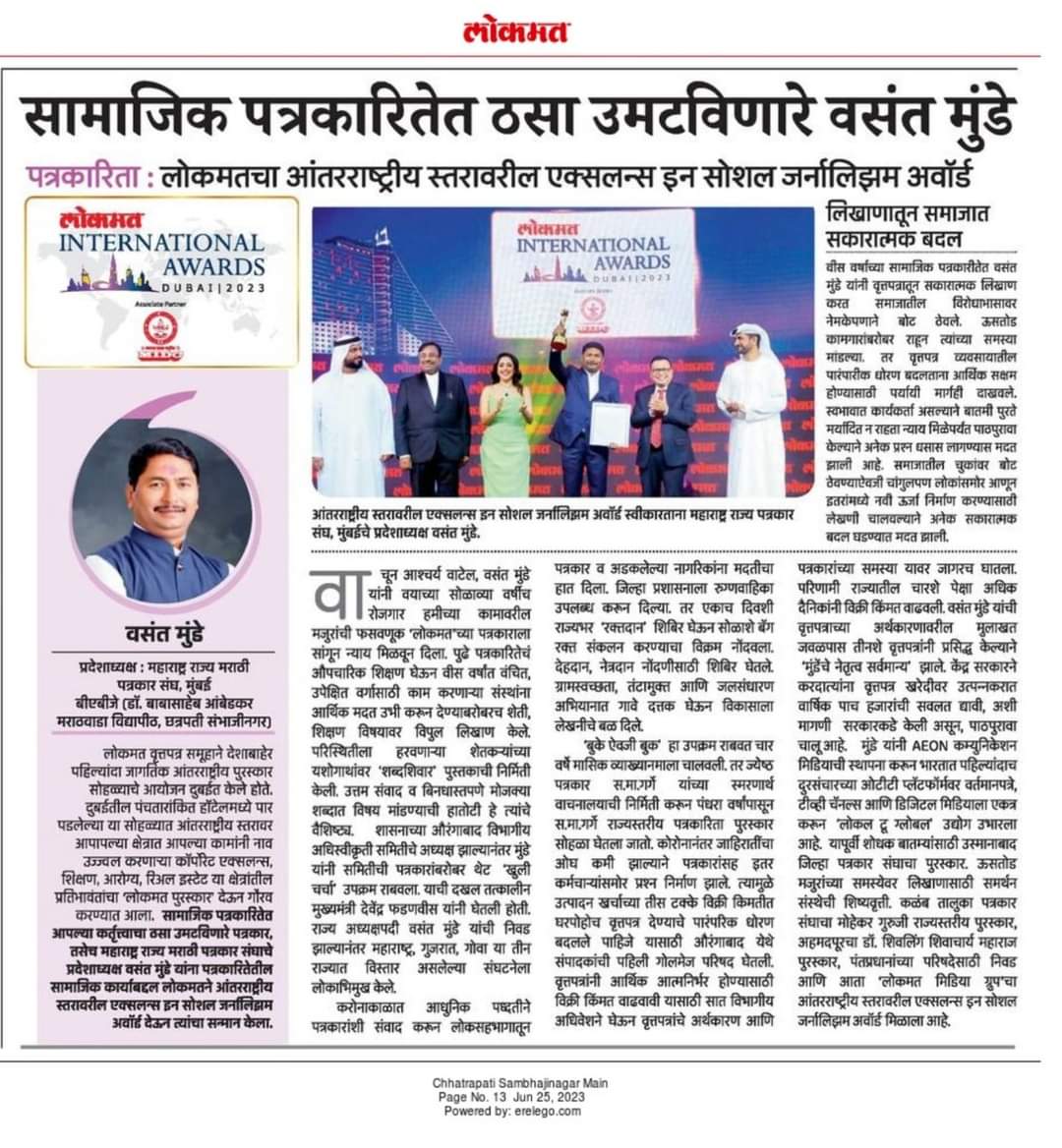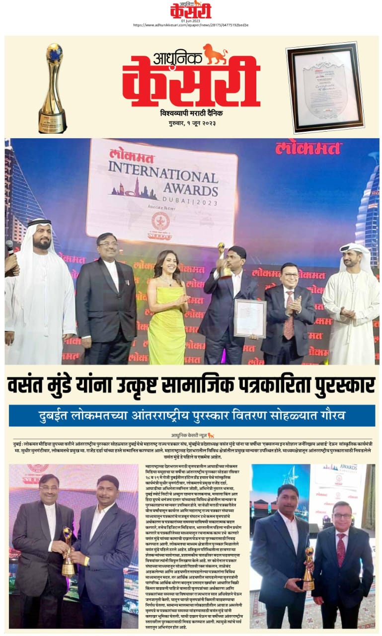 लोकमत मीडिया ग्रुपच्या वतीने आंतरराष्ट्रीय पुरस्कार सोहळ्यात दुबई येथे महाराष्ट्र राज्य पत्रकार संघ, मुंबई चे प्रदेशाध्यक्ष वसंत मुंडे यांना या वर्षीचा ‘एक्सलन्स इन सोशल जर्नालिझम अवार्ड’ देऊन सांस्कृतिक कार्यमंत्री मा. सुधीर मुनगंटीवार, लोकमतचे प्रमुख मा. राजेंद्र दर्डा यांच्या हस्ते सन्मानित करण्यात आले. महाराष्ट्रासह देशभरातील विविध क्षेत्रांतील प्रमुख मान्यवर उपस्थित होते. माध्यमक्षेत्रातून आंतरराष्ट्रीय पुरस्कारासाठी निवडलेले वसंत मुंडे हे पहिले व एकमेव आहेत. महाराष्ट्र राज्य मराठी पत्रकार संघाच्या माध्यमातून पत्रकारांचे मजबूत संघटन उभे करून वृत्तपत्रांचे अर्थकारण आणि पत्रकारांच्या समस्या याविषयी सकारात्मक बदल करणारे वसंत मुंडे यांच्या कामाची दखल या पुरस्कारासाठी निवड करण्यात आली.