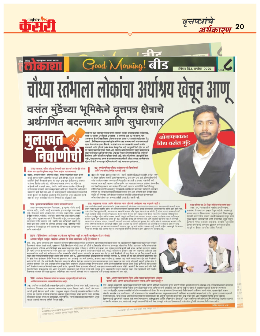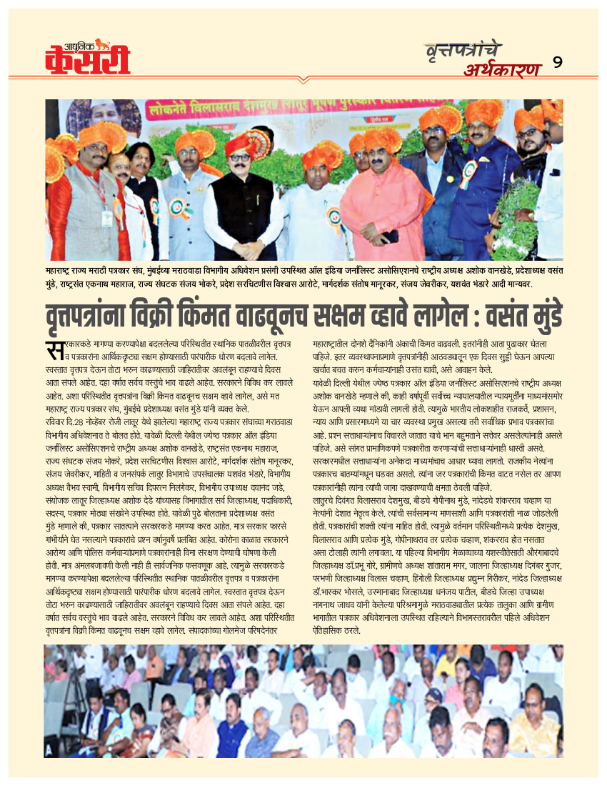 कोरोना, ऑनलाईन वाचन इ. अनेक कारणांमुळे वृत्तपत्रांचे आर्थिक गणित बिघडले, अनेक पत्रकारांना पगार कपातीला समोर जावे लागले तर काहींना आपली नोकरी गमवावी लागली. अशा परिस्थितीत वसंत मुंडे यांनी औरंगाबाद येथे संपादकांची पहिली गोलमेज परिषद घेऊन वृत्तपत्रांना आर्थिकदृष्ट्या सक्षम होण्याचं आवाहन केले. सर्व वस्तूंच्या बाजारातील किंमती वाढत असतांना वृत्तपत्रांच्या किमतीत मात्र तशी वाढ झाली नाही. उत्पादनखर्चापेक्षाही कमी किंमतीत वृत्तपत्रे विकली जातात हे असे एकमेव उत्पादन आहे. जाहिरात कमी झाल्याने तोटा भरून काढणे अशक्य आहे अश्या वेळी विक्री किंमत वाढविण्याचे गणित वृत्तपत्रांचे मालक, संपादक, वितरक यांना पटवून दिले. त्यांची ‘वृत्तपत्रांचे अर्थकारण’ ही मुलाखत ३००पेक्षा अधिक वृत्तपत्रांनी प्रसिद्ध केली. एका पत्रकाराची मुलाखत विविध दैनिकांत प्रसिद्ध होण्याची ही पहिलीच वेळ. वसंत मुंडे यांचे नेतृत्व सर्वमान्य असल्याची ही जणू पावतीच होती.