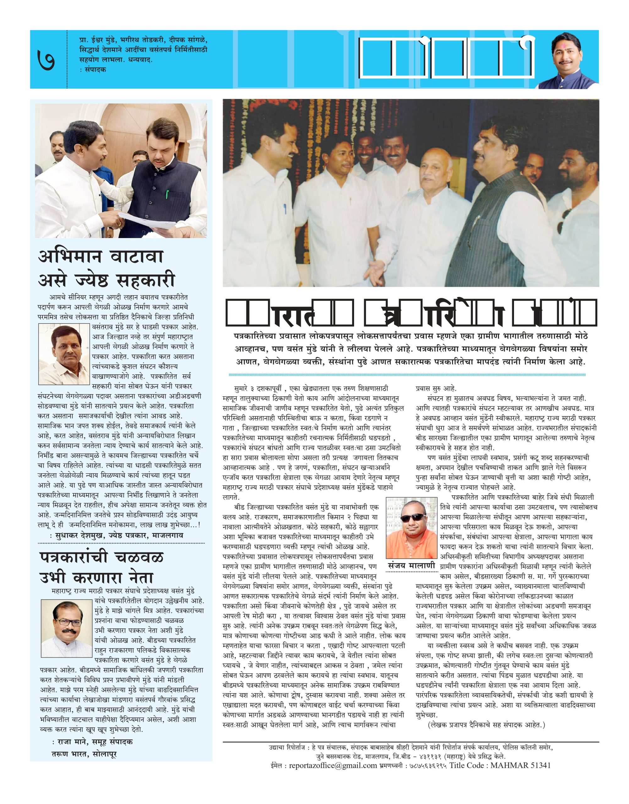 पत्रकार संवाद यात्रेला मिळालेला प्रतिसाद अभूतपूर्व तर होताच पण या यात्रेला मिळालेल्या प्रतिसादाने आणखी एक महत्वाची गोष्ट झाली ती म्हणजे पत्रकारांचा नायक म्हणून महाराष्ट्राने वसंत मुंडे या नावावर केलेले शिक्कामोर्तब. या घटनेचे सविस्तर विश्लेषण करणारा ‘पत्रकारांचा नायक …!” हा पत्रकार संतोष मानूरकर यांचा लेख तुम्ही नक्की वाचला पाहिजे. वसंत मुंडे यांनी त्यांच्या कारकिर्दीच्या सुरवातीपासून तर पत्रकार संवाद यात्रेपर्यंत दिलेल्या योगदानाचा नीट लेखा-जोखा या लेखात मांडला आहे.