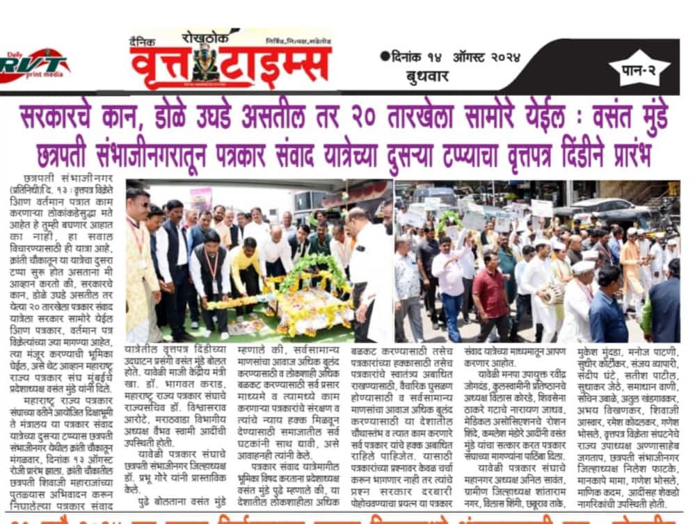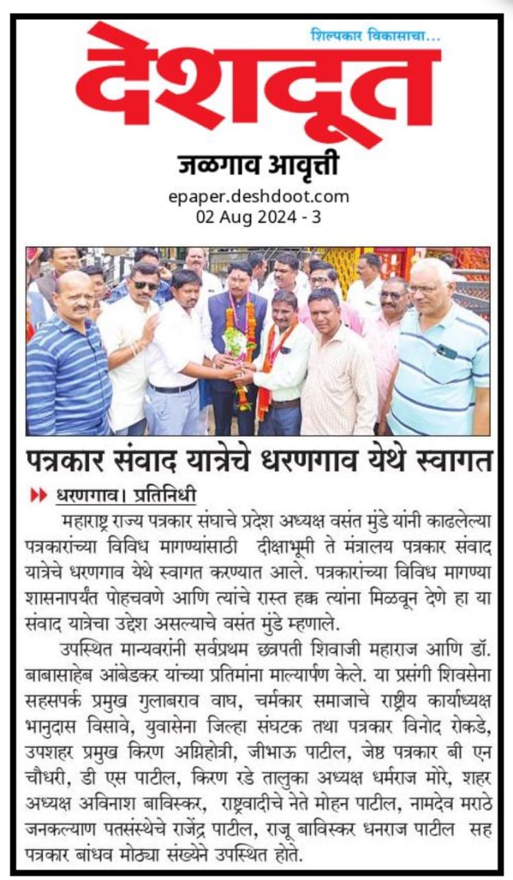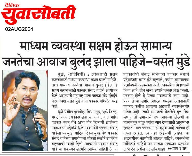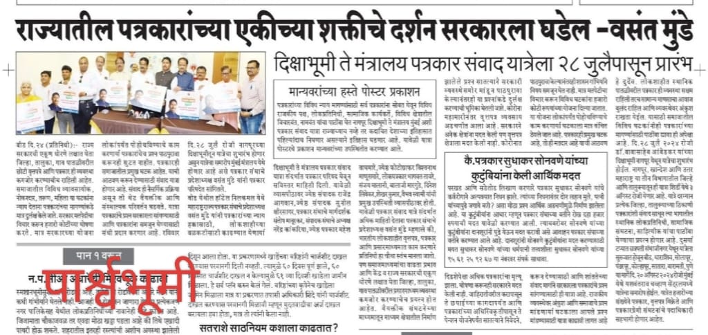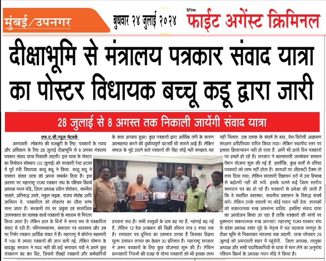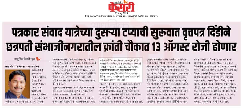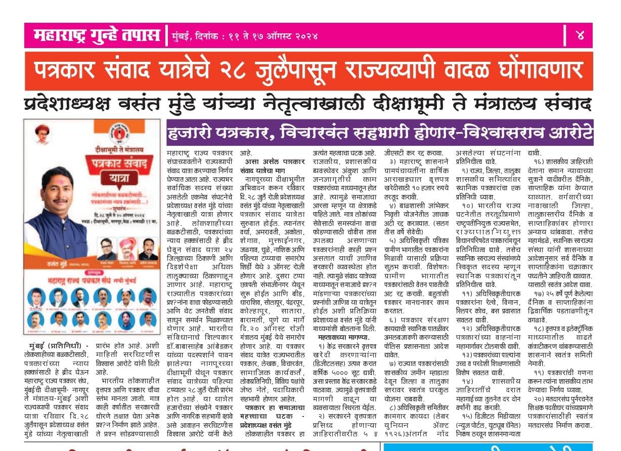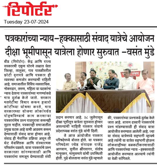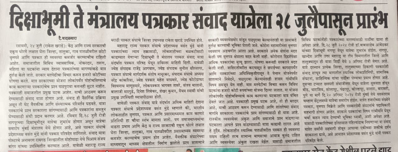 “लोकशाहीच्या बळकटीसाठी, पत्रकारांच्या न्याय हक्कांसाठी” हे ब्रीद घेऊन महाराष्ट्र राज्य पत्रकार संघ, मुंबईचे प्रदेशाध्यक्ष वसंत मुंडे यांच्या नेतृत्वाखाली दीक्षाभूमी- नागपूर ते मंत्रालय-मुंबई अशी राज्यव्यापी पत्रकार संवाद यात्रेला २८ जुलै २०२४ला प्रारंभ झाला.