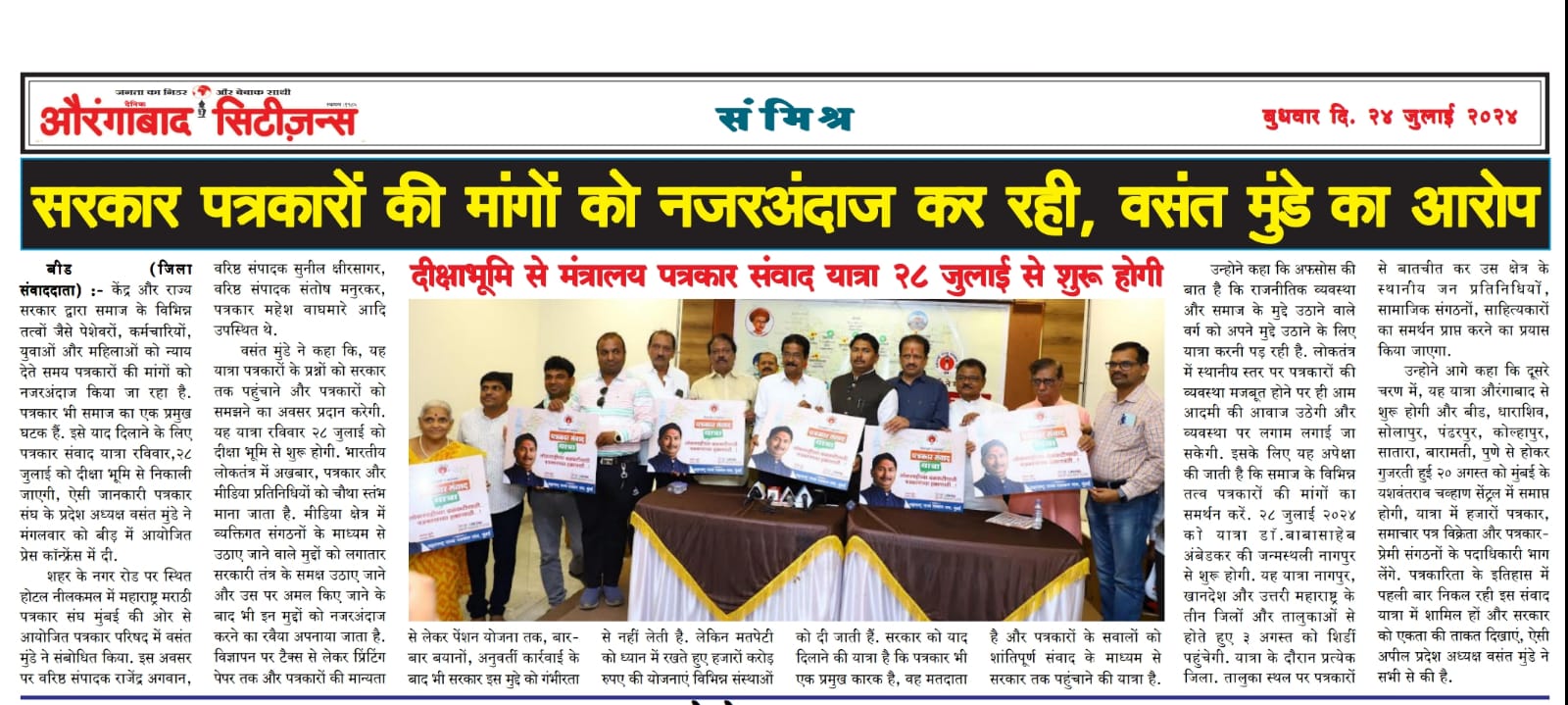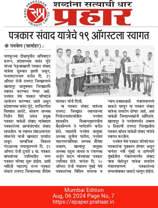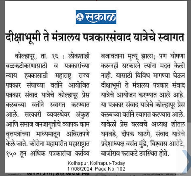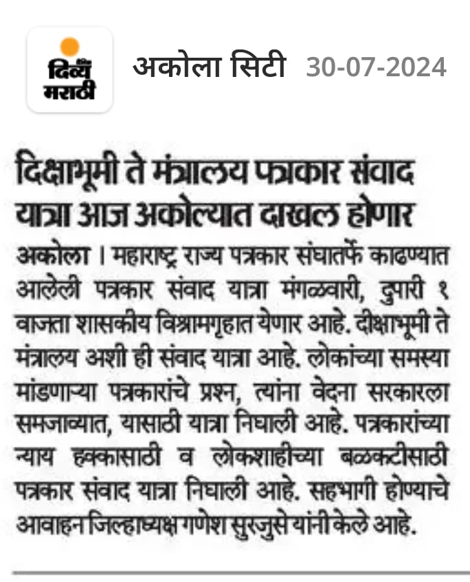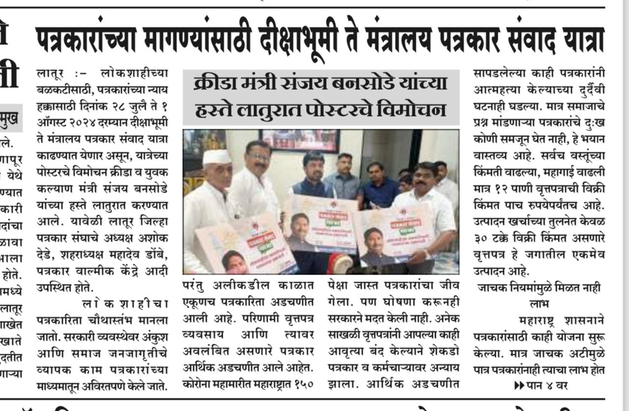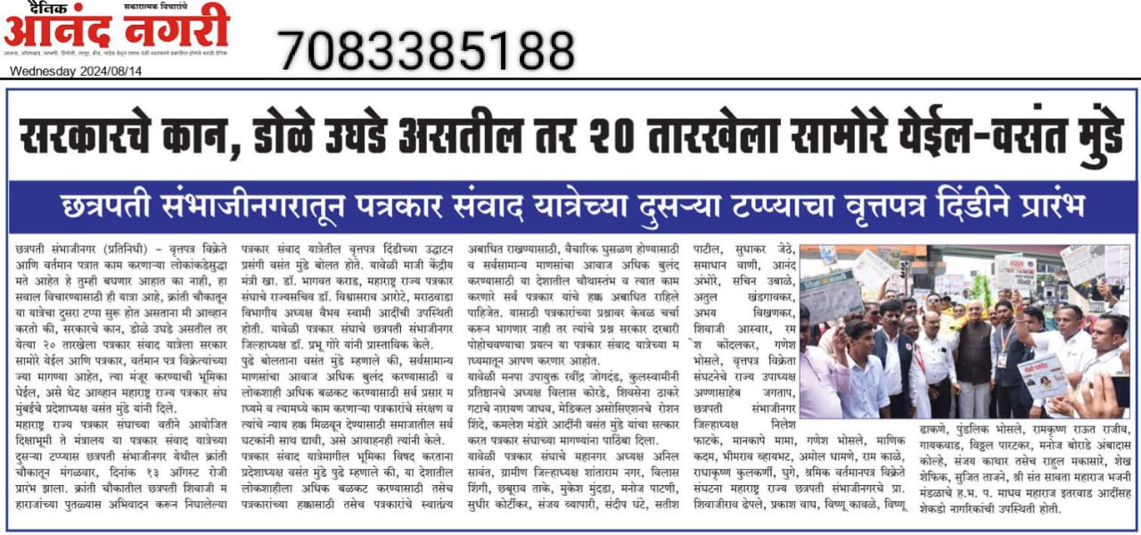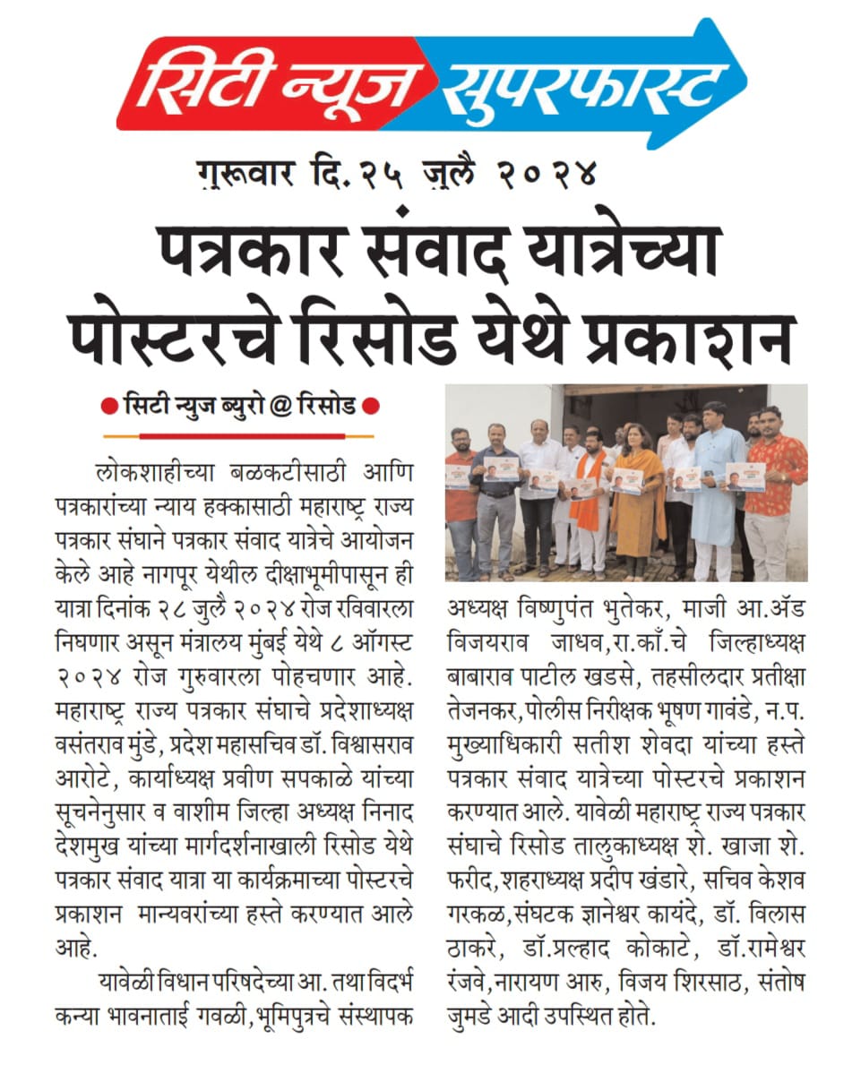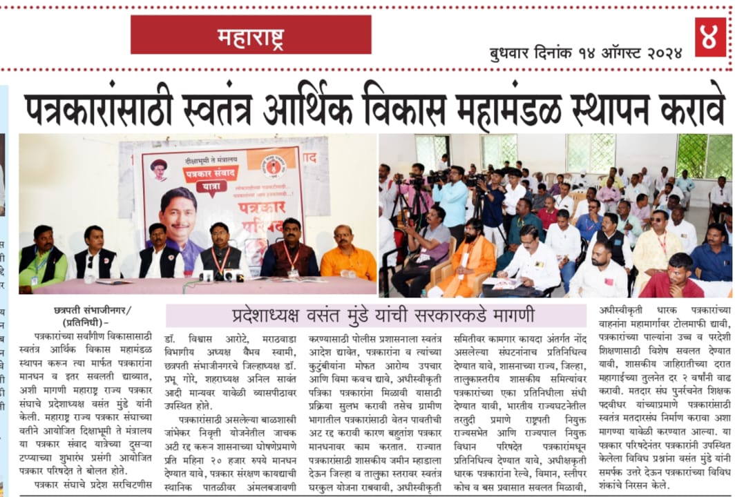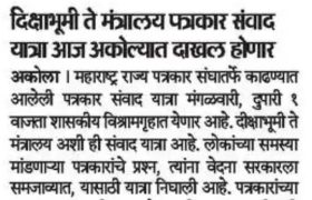 “लोकशाहीच्या बळकटीसाठी, पत्रकारांच्या न्याय हक्कांसाठी” हे ब्रीद घेऊन महाराष्ट्र राज्य पत्रकार संघ, मुंबईचे प्रदेशाध्यक्ष वसंत मुंडे यांच्या नेतृत्वाखाली दीक्षाभूमी- नागपूर ते मंत्रालय-मुंबई अशी राज्यव्यापी पत्रकार संवाद यात्रेला २८ जुलै २०२४ला प्रारंभ झाला.