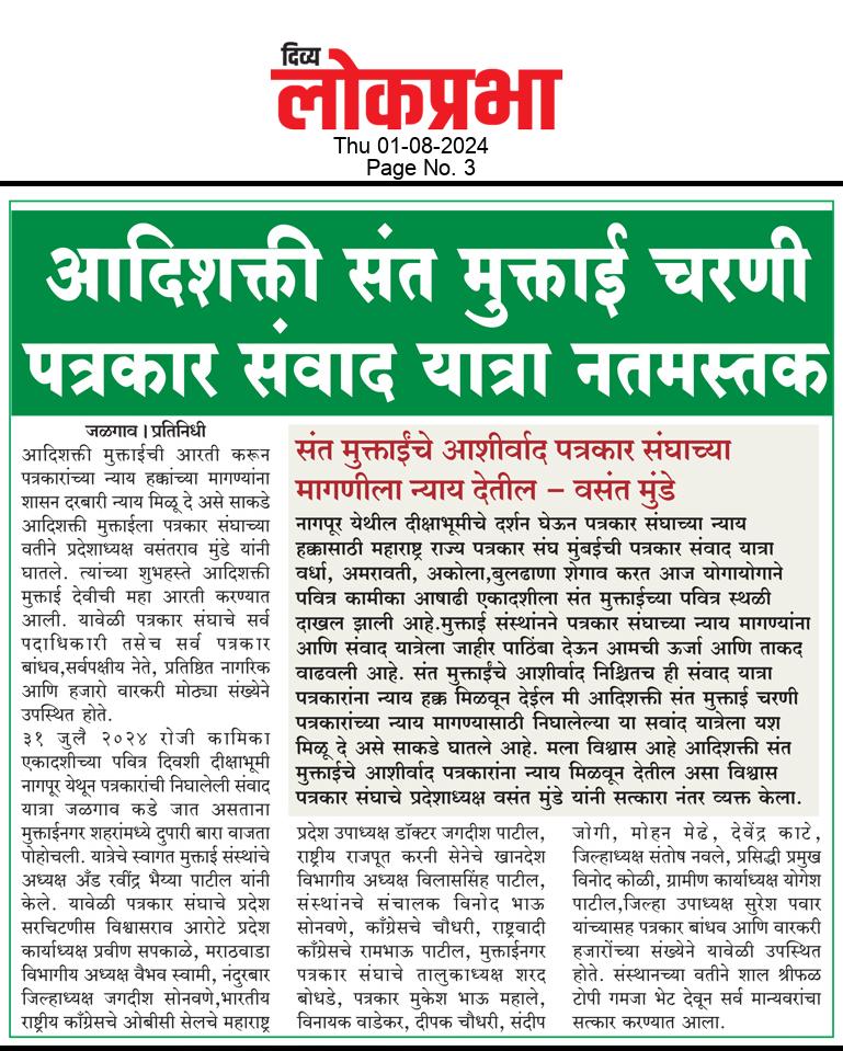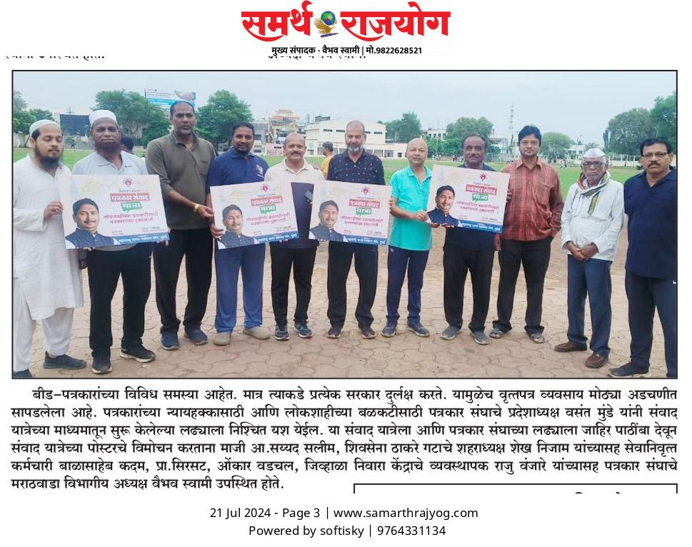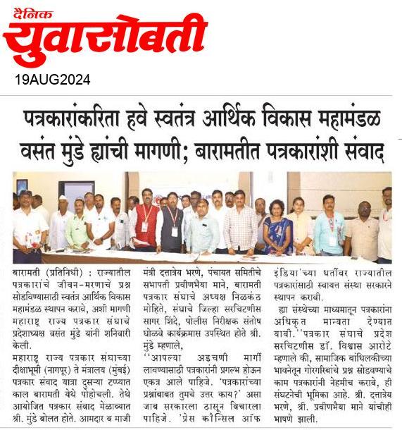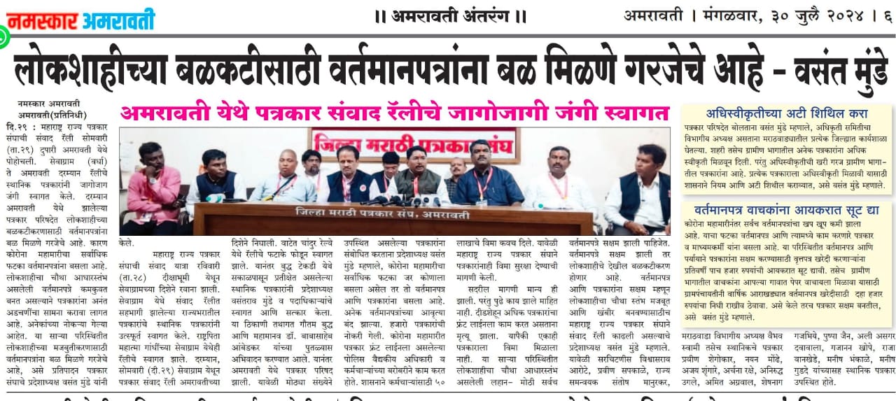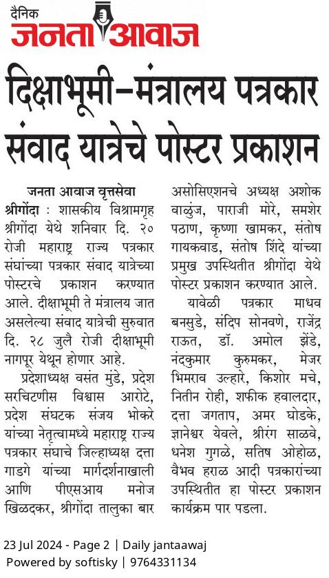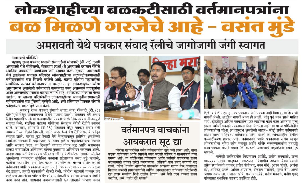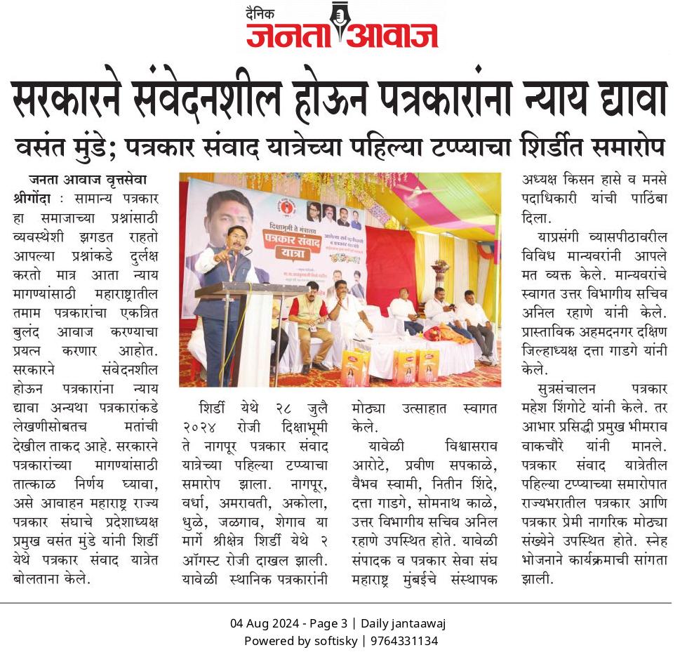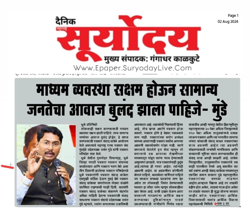 “लोकशाहीच्या बळकटीसाठी, पत्रकारांच्या न्याय हक्कांसाठी” हे ब्रीद घेऊन महाराष्ट्र राज्य पत्रकार संघ, मुंबईचे प्रदेशाध्यक्ष वसंत मुंडे यांच्या नेतृत्वाखाली दीक्षाभूमी- नागपूर ते मंत्रालय-मुंबई अशी राज्यव्यापी पत्रकार संवाद यात्रेला २८ जुलै २०२४ला प्रारंभ झाला.