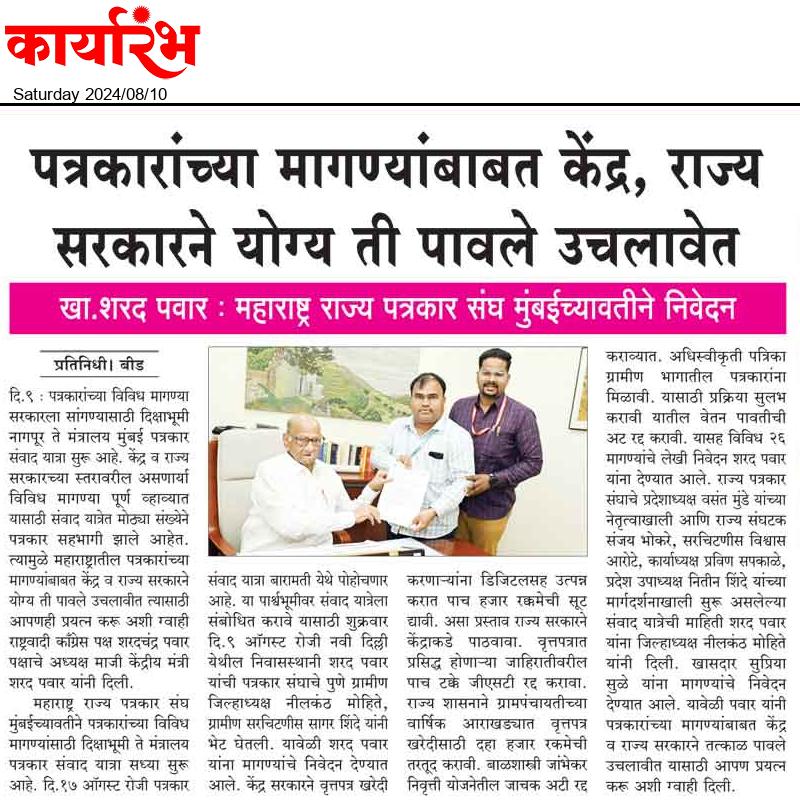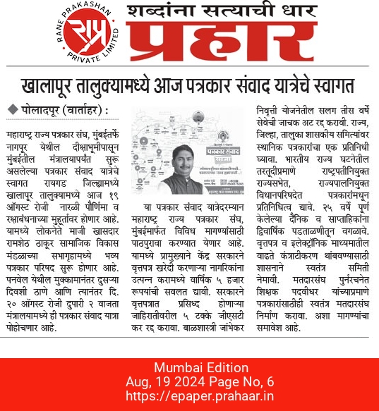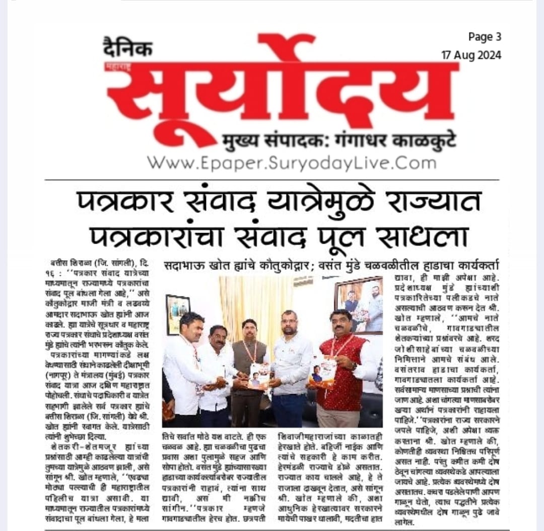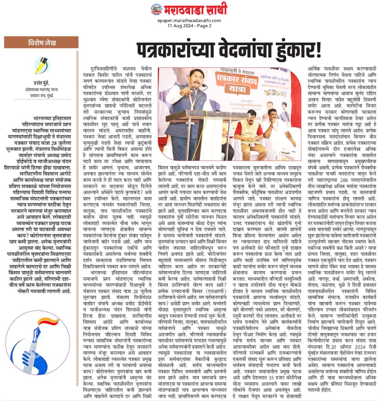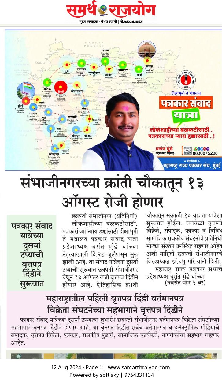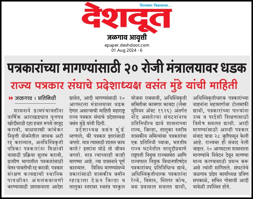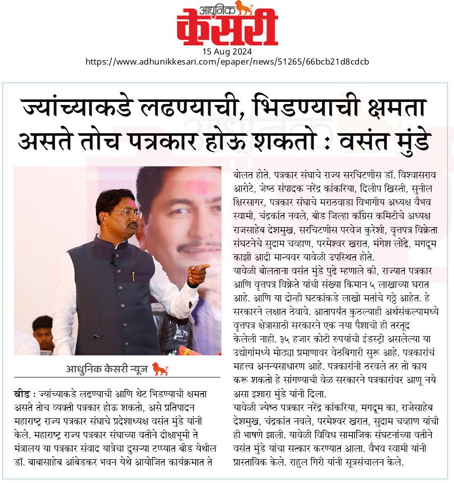 “लोकशाहीच्या बळकटीसाठी, पत्रकारांच्या न्याय हक्कांसाठी” हे ब्रीद घेऊन महाराष्ट्र राज्य पत्रकार संघ, मुंबईचे प्रदेशाध्यक्ष वसंत मुंडे यांच्या नेतृत्वाखाली दीक्षाभूमी- नागपूर ते मंत्रालय-मुंबई अशी राज्यव्यापी पत्रकार संवाद यात्रेला २८ जुलै २०२४ला प्रारंभ झाला.