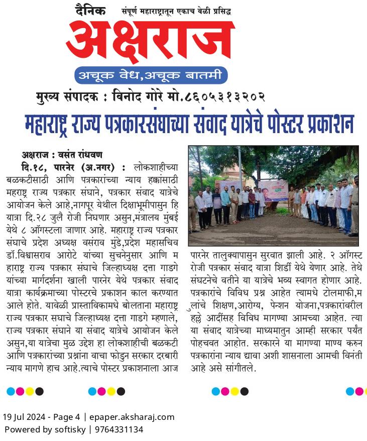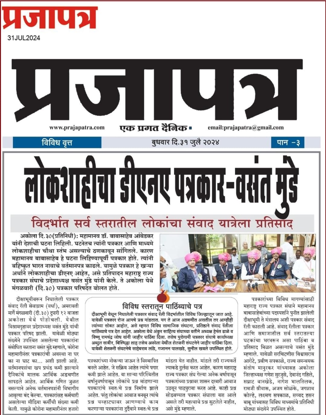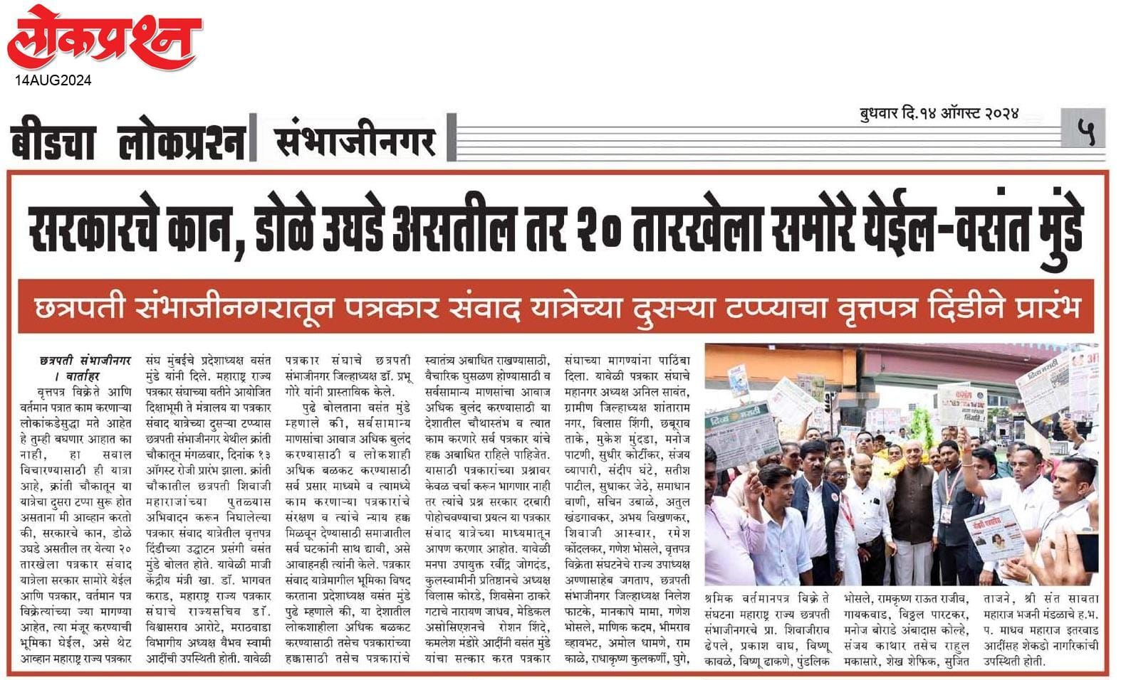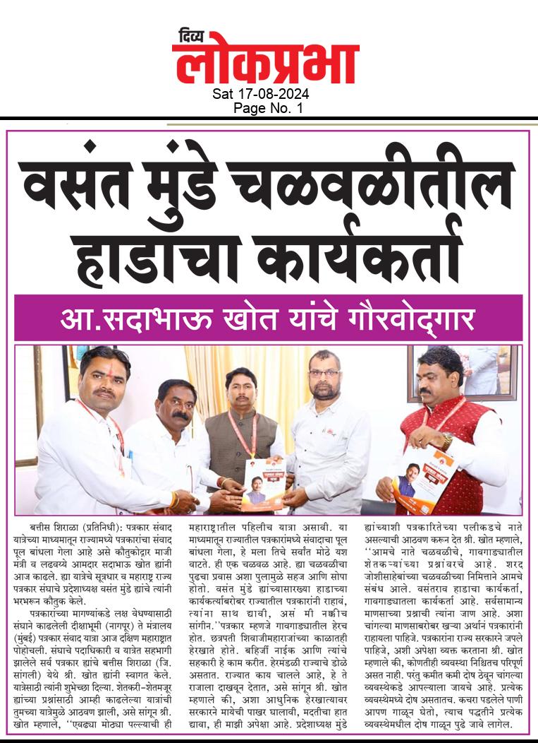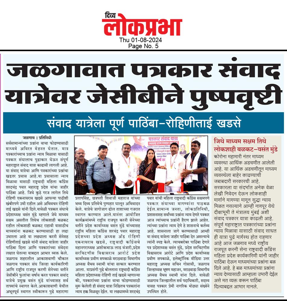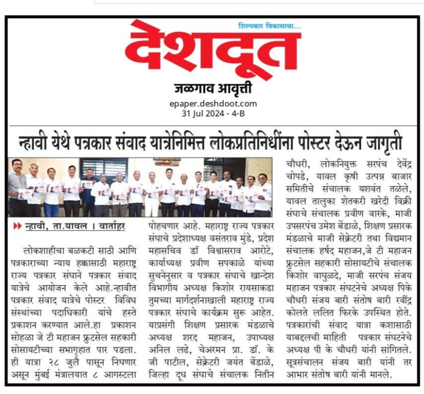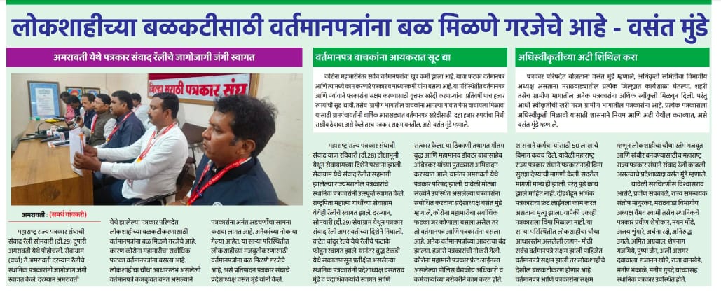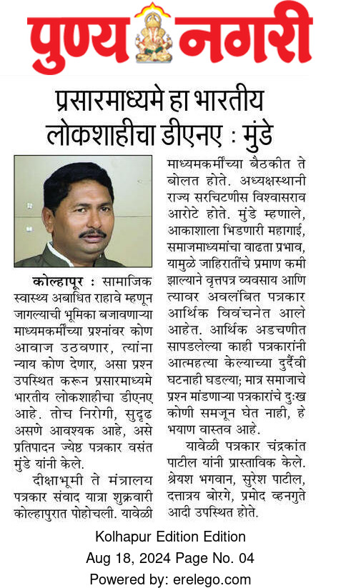 “लोकशाहीच्या बळकटीसाठी, पत्रकारांच्या न्याय हक्कांसाठी” हे ब्रीद घेऊन महाराष्ट्र राज्य पत्रकार संघ, मुंबईचे प्रदेशाध्यक्ष वसंत मुंडे यांच्या नेतृत्वाखाली दीक्षाभूमी- नागपूर ते मंत्रालय-मुंबई अशी राज्यव्यापी पत्रकार संवाद यात्रेला २८ जुलै २०२४ला प्रारंभ झाला.