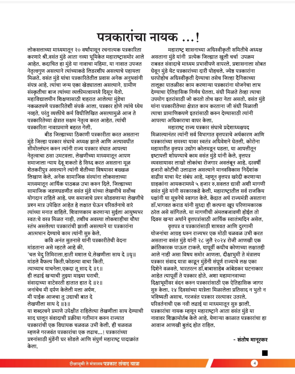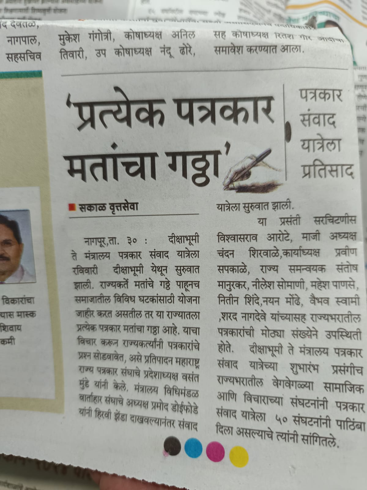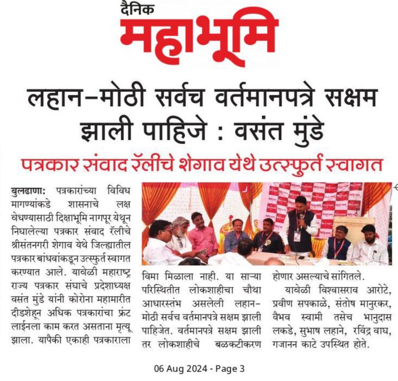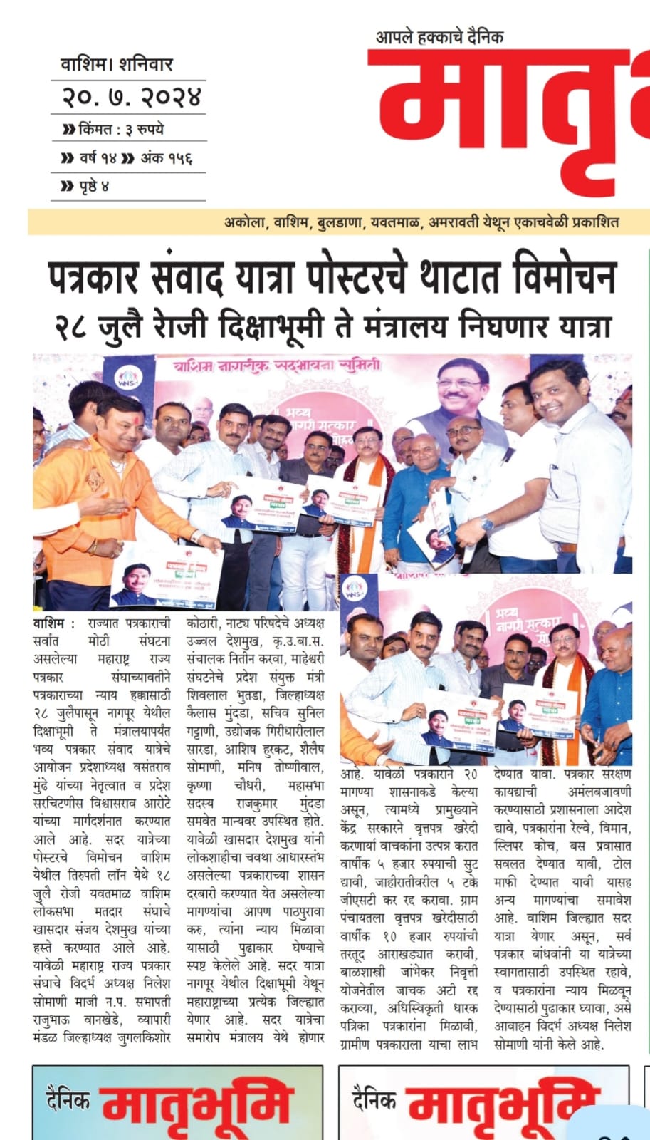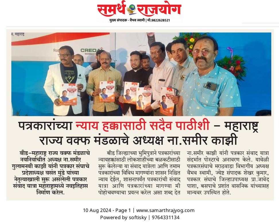 “लोकशाहीच्या बळकटीसाठी, पत्रकारांच्या न्याय हक्कांसाठी” हे ब्रीद घेऊन महाराष्ट्र राज्य पत्रकार संघ, मुंबईचे प्रदेशाध्यक्ष वसंत मुंडे यांच्या नेतृत्वाखाली दीक्षाभूमी- नागपूर ते मंत्रालय-मुंबई अशी राज्यव्यापी पत्रकार संवाद यात्रेला २८ जुलै २०२४ला प्रारंभ झाला.