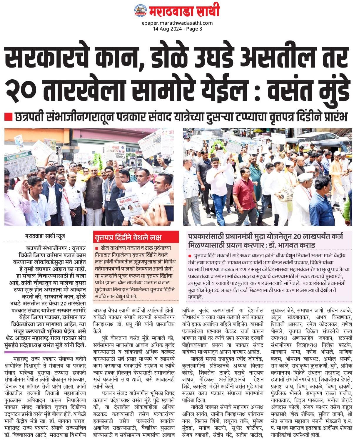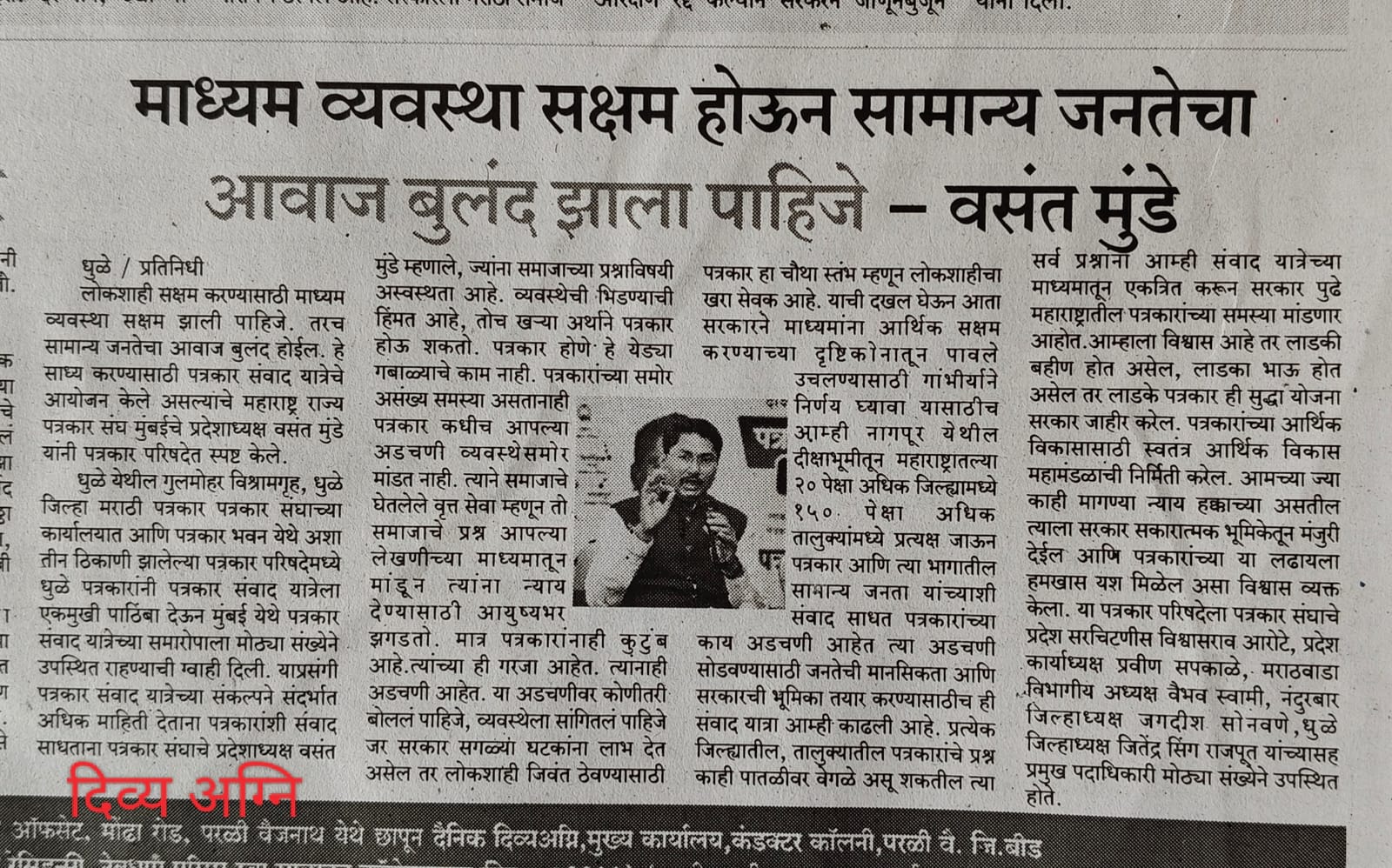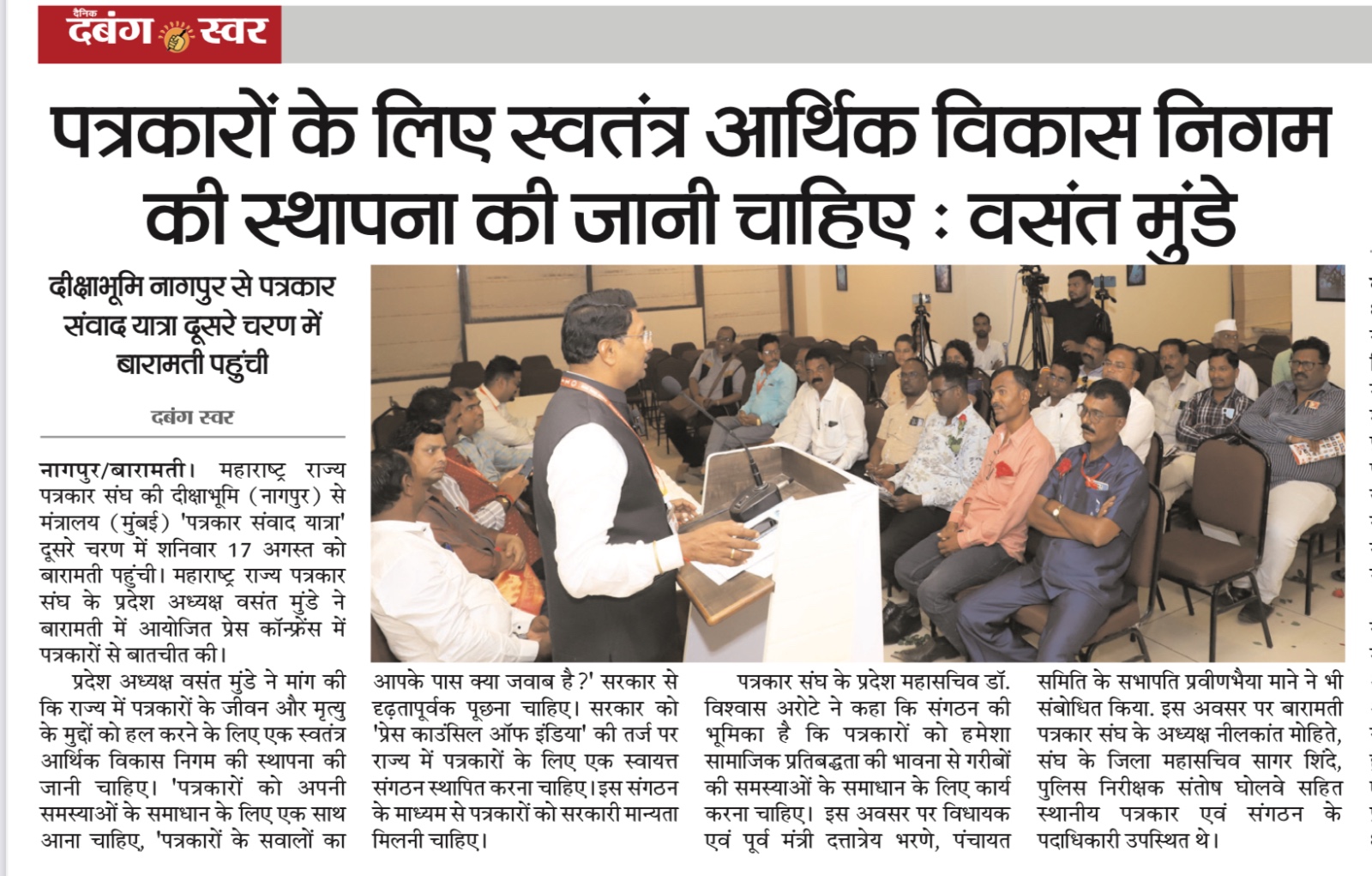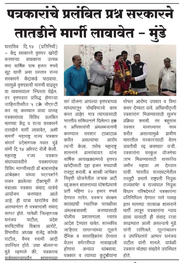 संपूर्ण राज्यभर सर्वाधिक सदस्य संख्या असलेली महाराष्ट्र राज्य पत्रकार संघ, मुंबई ही एकमेव संघटना आहे. या संघटनेचे सक्षम नेतृत्व प्रदेशाध्यक्ष वसंत मुंडे महाराष्ट्र राज्यातील पत्रकारांच्या प्रश्नांना वाचा फोडण्यासाठी आणि थेट जनतेशी संवाद साधण्याच्या दृष्टीने राज्यव्यापी पत्रकार संवाद यात्रा आयोजित केली. भारतीय संविधानाचे शिल्पकार डॉ.बाबासाहेब आंबेडकर यांच्या पदस्पर्शाने पावन झालेल्या नागपूरच्या दीक्षाभूमी येथून या पत्रकार संवाद यात्रेच्या पहिल्या टप्प्याला २८ जुलै रोजी प्रारंभ झाला.