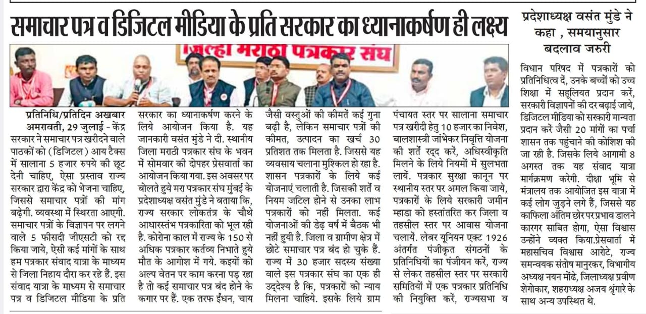 १) केंद्र सरकारने वृत्तपत्र खरेदी करणाऱ्यांना (डिजीटलसह) उत्पन्न करात वार्षिक ५००० सूट द्यावी. असा प्रस्ताव केंद्र सरकारकडे पाठवावा.