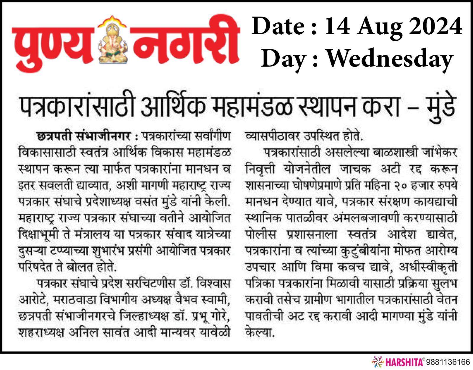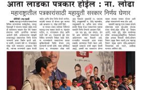 १३) मुंबईप्रमाणे म्हाडा अंतर्गत शासकीय जमीन म्हाडाला देऊन जिल्हा व तालुका स्तरावर पत्रकारांसाठी स्वतंत्र गृहनिर्माण प्रकल्प राबवावा.