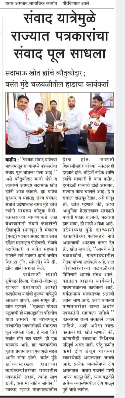 पत्रकार हा खऱ्या अर्थाने समाजाचा आरसा आहे. तो समाजातील अतिशय महत्वाचा घटक आहे. लोकांच्या प्रश्नांना वाचा फोडण्यासाठी २४ तास उपलब्ध असणाऱ्या पत्रकारांचेही प्रश्न असतात याची जाणीवच राज्यकर्ते आणि लोकप्रतिनिधींना नाही. या सर्व बाबींचा संवाद यात्रेत उहापोह झाला.